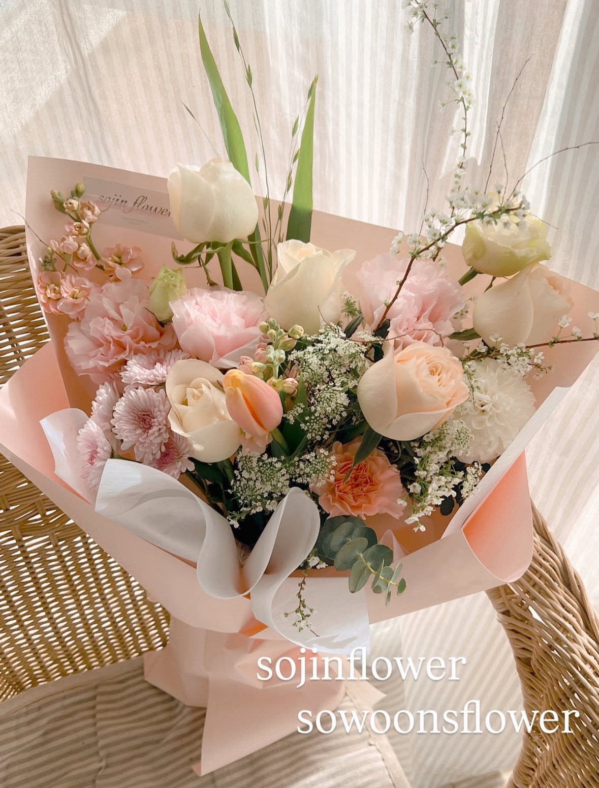장미, 튤립, 리시안셔스, 프리지아, 스카비오사, 아미초, 스토크, 버터플라이 라넌큘러스, 보리사초, 설유화, 소국, 유칼립투스 등 담아 구성했습니다.