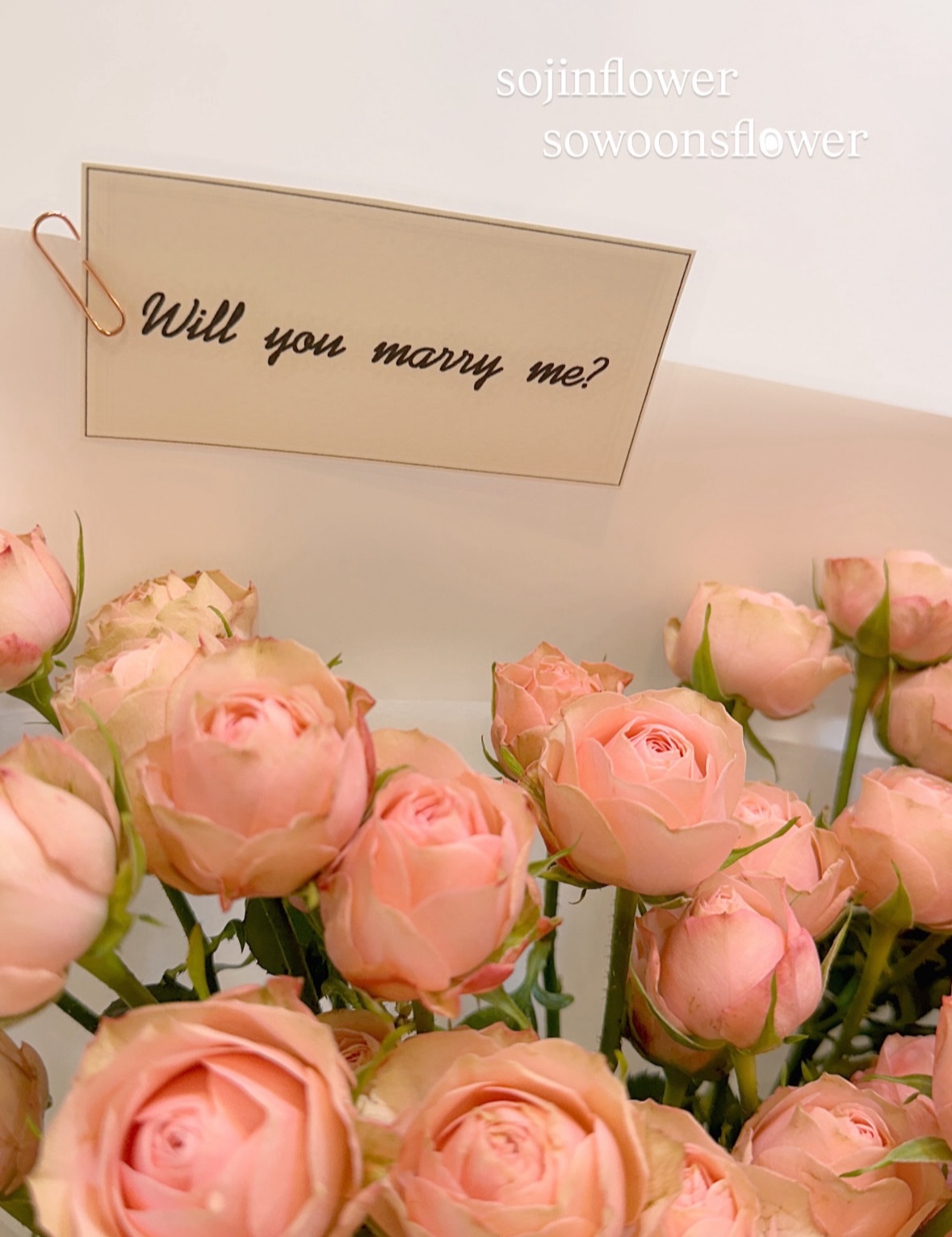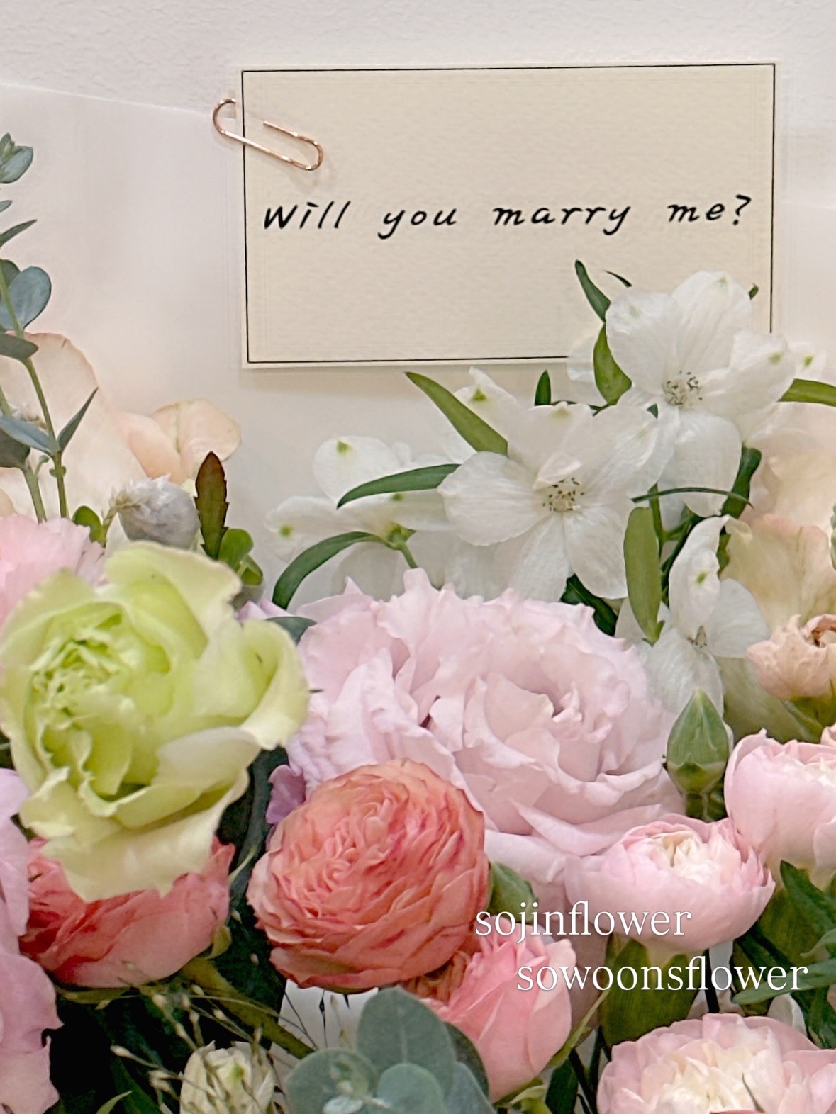 사랑스러운 꽃과 함께 프로포즈 단골 메시지 Will you marry me? 같이 준비해드렸습니다.